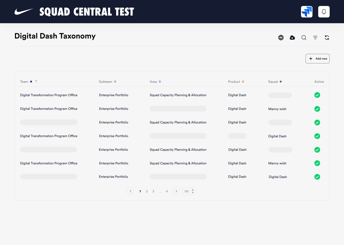 The revamped "Digital Dash Taxonomy" page, advancing from a basic team list, now integrates multiple functionalities to enhance user experience. Accessible via the Dashboard or squad pages, it features new icons for team searching and filtering, direct email functionalities, data download, notification viewing, Jira integration for project management, and live updates.